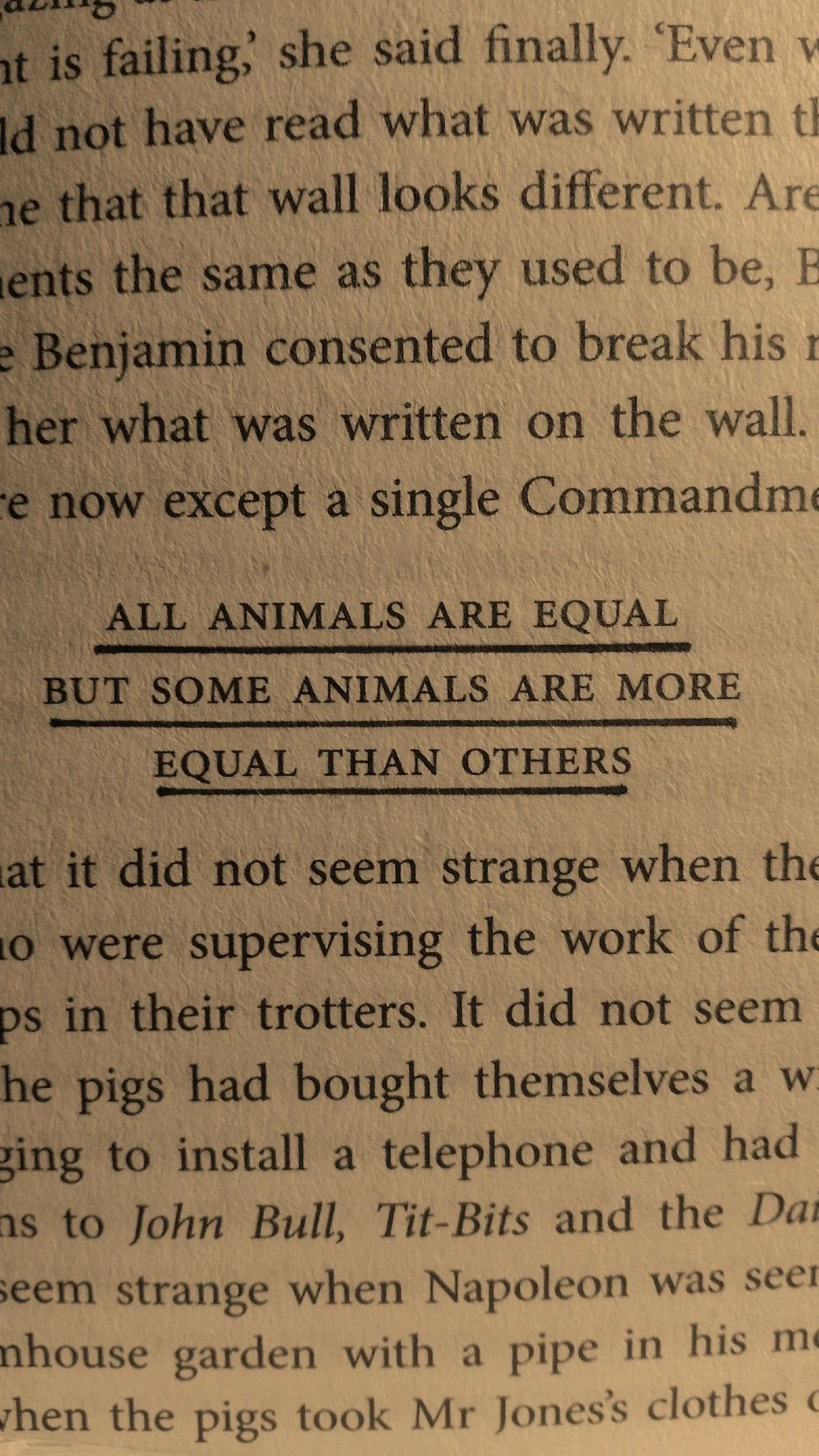 What shocked me most was how familiar it all felt, Orwell shows that propaganda isn’t just about making people believe falsehoods but also making them doubt their own memories, their own instincts. The animals saw things change, they heard different promises and yet, when the pigs told them otherwise, they questioned themselves rather than their leaders. it made me wonder, how often does this happen in the real world? How many times have I accepted something as a fact just because it was repeated enough times? And if the truth can be rewritten so easily, how do we ever really know what to believe.